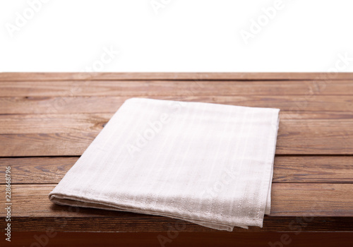 Wooden deck table with tablecloth isolated on white. Kitchen background, product montage display. Mock up.
