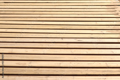 Wooden decking on the beach, close-up on the boards. Boardwalk. Background. Weathered wooden boards with scattered sand, summer warm lighting. Selective focus