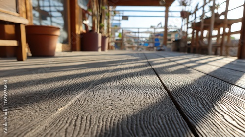 Wooden Decking with Sunlight and Shadows in Outdoor Setting with Terra Cotta Pots and Distant Furniture