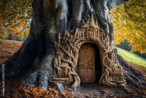 tree, carved, door, fairy tale, earth, nature, natural, fantasy, fantastic, fancy, fiction, trunk, carving, autumn, leaf, forest, wood, design, intricate, foliage, wildlife, whimsical, craftsmanship, greenery, magic, landscape, brown, orange, yellow, environment, seasonal, bark, organic, entrance, picturesque, adventure, charming, rural, colourful, exploration, calmness, detail, scenery, fairy, tale, inviting, imaginative, peaceful