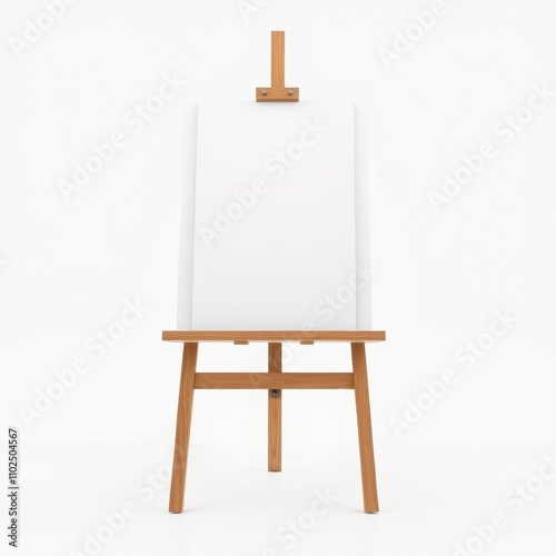 Wooden easel with a large blank canvas in the center, surrounded by empty space on a white background, studio setup, art studio, artistic equipment