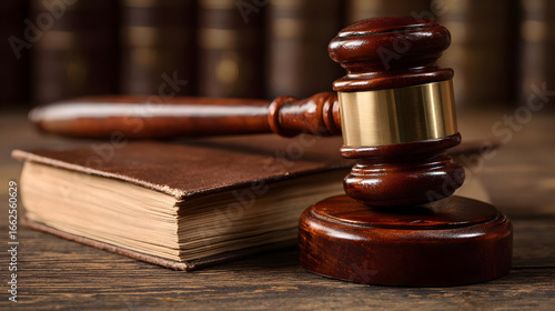 Wooden Gavel and Aged Law Book on Dark Wood Table