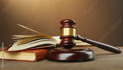 Wooden gavel and books on wooden table, law concept