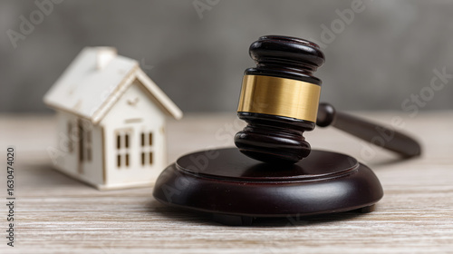 Wooden gavel rests near miniature house depicting property law and real estate auction concept