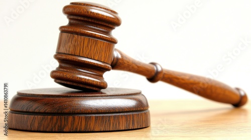 Wooden gavel rests on block, gleaming under lighting