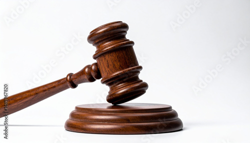Wooden gavel striking a sound block, isolated on a white background, symbol of justice and legal authority