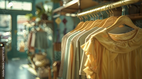 Wooden hangers holding shirts and blouses. A rack of chic, casual items in soft colors is displayed. The light from large windows creates a warm atmosphere.
