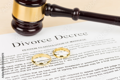 Wooden judge gavel, golden rings, and divorce decree; document is mock-up