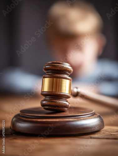 Wooden judge gavel with gold band placed on sound block with blurred child figure in background symbolizing justice and legal decisions related to youth cases