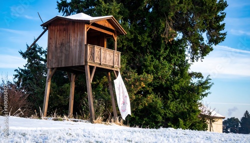 wooden, tower, snowy, landscape, lookout, winter, hill, cabin, nature, chalet, rustic, exterior, snow, blue, sky, tree, pine, daylight, peaceful, quiet, countryside, village, house, elevated, platform, flag, fabric, cold