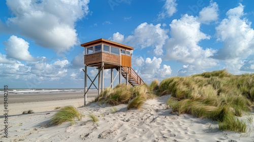 beach, sand, sky, cloud, dune, grass, tower, wooden, lookout, ocean, horizon, seascape, coastline, water, nature, summer, daytime, blue, white, brown, green, landscape, travel, photo, vacation, holiday, sea, shore, wave, sandy, beachfront, natural, beautiful, scenic, view, calm, serenity, sun, bright