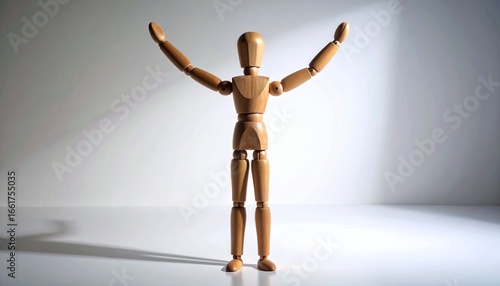 mannequin, wooden, figure, model, dummy, pose, arm, raised, gesture, symbolic, freedom, success, victory, celebration, expression, concept, creativity, art, sculpture, minimal, simple, design, studio, isolated, background, learning, practice, education, training, illustration, human, body, movement, motion, abstract, emotion, achievement, happy, joy, idea, representation, workshop, still life, hobby, artistic