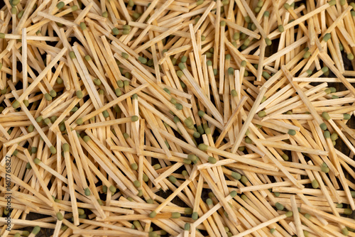 wooden matches scattered in a large pile, scattered wooden matches without matchboxes on the table, close up