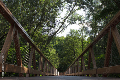 bridge, wooden, nature, landscape, park, tree, green, summer, wood, outdoors, perspective, forest, travel, path, beautiful, walk, hiking, footbridge, background, below, footpath, environment, construction, tour tourism, sky, way, pathway, trail, low, road, rural, plant, view, paseo, nobody, route, architecture, country, spring, day, foliage, scenic, transportation, wood, sidewalk, tunnel, sunlight, journey, vacation
