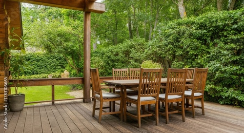 dining, wooden, table, patio, furniture, deck, garden, backyard, summer, nature, relaxation, al, fresco, eating, outdoors, chair, wood, natural, light, greenery, tree, hedge, lawn, countryside, rural, rustic, home, house, exterior, architecture, set, seating, leisure, tranquil, peaceful, serene, sunny, day, bright, daytime, no, people, empty, inviting, comfortable, cosy, entertaining, lifestyle