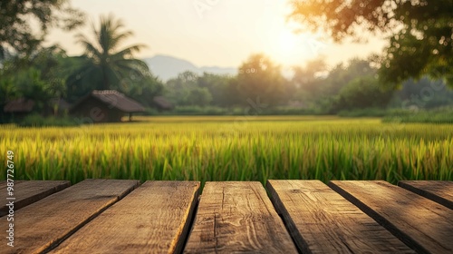 wooden, plank, table, surface, background, rice, paddy, field, sunset, sun, gold, green, grass, leaf, landscape, horizon, sky, nature, rural, farm, agriculture, tropical, summer, evening, warm, light, blur, bokeh, sharpened, shallow, depth, texture, grain, brown, yellow, vibrant, serene, peaceful, tranquil, calm
