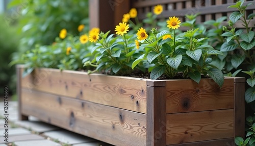 Wooden Planter with Yellow Flowers Outdoors in Garden Setting