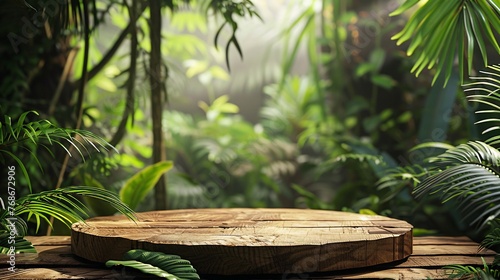 wooden podium in tropical forest. realistic 3d rendering . platform for product presentation . ai generative