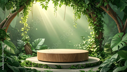 Wooden podium lush green vines glowing leaves soft sunlight nature inspired forest round stage tropical foliage natural light peaceful atmosphere. round wooden podium encircled by lush green vines