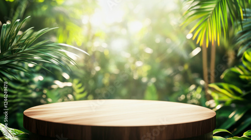 Wooden podium surrounded by lush jungle under warm sunlight