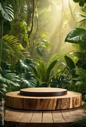 rainforest, platform, wooden, jungle, wood, circular, tree trunk, sunlight, foliage, canopy, nature, green, natural, tropical, plant, leaf, forest, background, scene, setting, showcase, display, decoration, element, design, image, graphic, illustration, visual, digital artwork, photo, artwork, ambience, atmosphere, dais, tree, plant, palm, tree, grass, summer