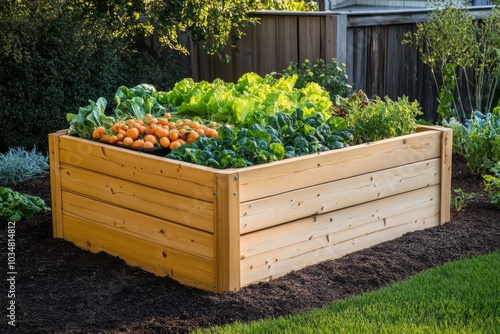 Wooden raised garden bed backyard is made light-colored vegetable