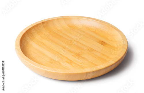 Wooden round saucer isolated on white background. Kitchen tools.