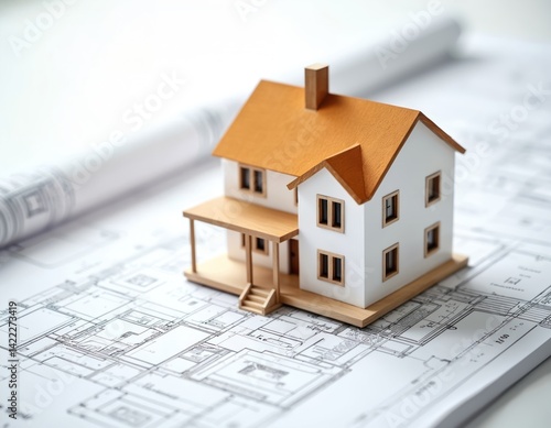 Wooden scale model house placed on architectural blueprint plans. Home design construction planning, real estate investment. White house miniature building on paper, creative concept of building