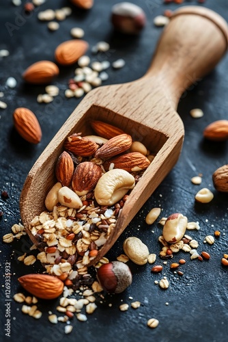 Wooden Scoop Filled with Assorted Nuts and Grains on Rustic Dark Table