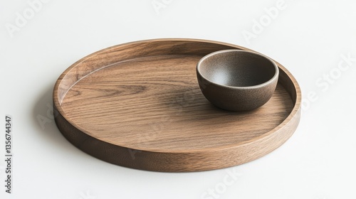 tray, wooden, serving, bowl, ceramic, brown, small, round, wood, surface, dark, empty, table, kitchen, home, minimalist, simple, clean, natural, texture, grain, smooth, design, contemporary, style, decoration, object, background, white, light, grey, matte, craft, minimal, interior, flat, lay, photo, still, life, studio