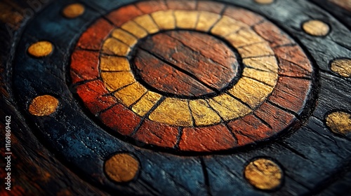 wood, shield, circular, design, painted, texture, gold, red, orange, blue, black, pattern, concentric, circle, rustic, antique, aged, art, craft, detail, closeup, macro, background, surface, grain, colours, vibrant, warm, cool, contrast, abstract, geometric, handcraft, decorative, style, element, ancient, traditional, motif, ornate