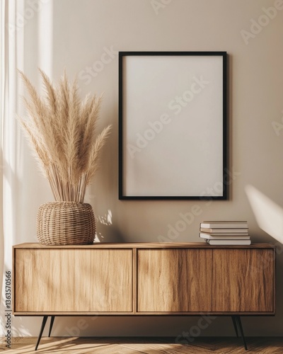 interior, design, home, decor, modern, minimalist, style, room, apartment, house, furniture, sideboard, cabinet, pampas, grass, frame, poster, book, beige, neutral, light, sun, shadow, wall, wooden, natural, texture, aesthetic, cosy, comfort, living, space, bohemian, rustic, vintage, simple, elegant, calm, serene