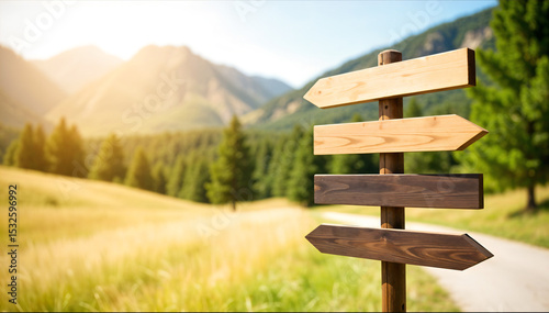 Wooden signpost with blank arrows in sunlit forest path, ideal for travel concepts