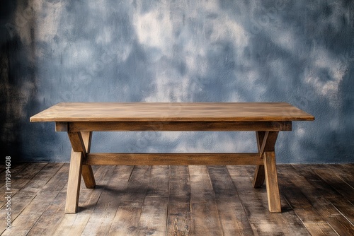 Wooden table against a textured blue backdrop.