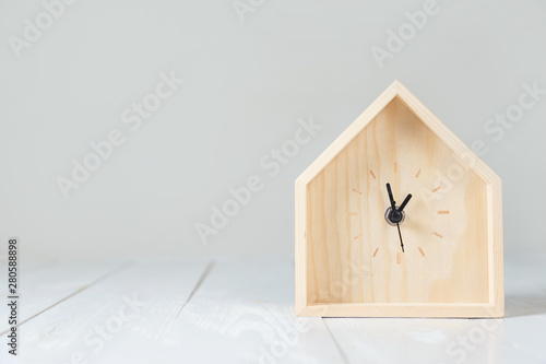 Wooden table clock in the shape of a house.