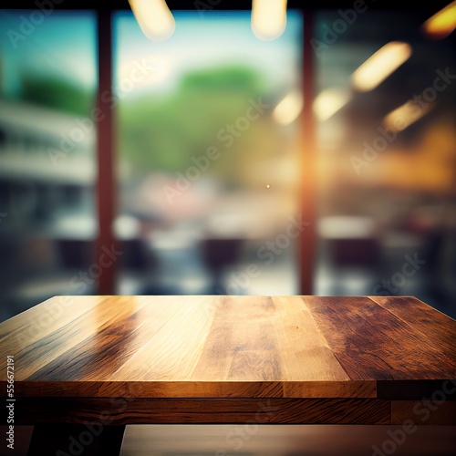Wooden table on blurred business room background. Generative AI