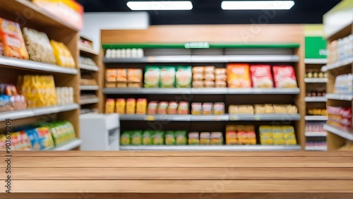 Wooden table with blur background of supermarket. Generative ai