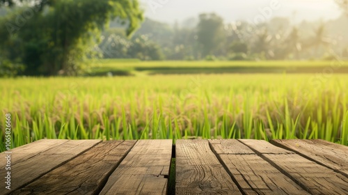 Wooden table with blurry rice field backdrop for product display or design layout. Ample space for text.