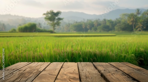 Wooden table with blurry rice field backdrop for product display or design layout. Ample space for text.