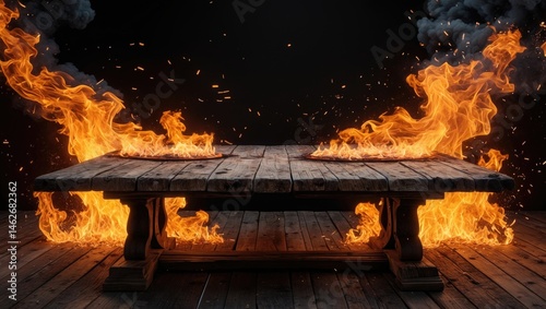 Wooden table with fire at the edge, featuring fire particles, sparks, and smoke in the air, with flames on a dark background for product display.