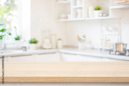 Wooden texture table with bright interior of kitchen as blurred background