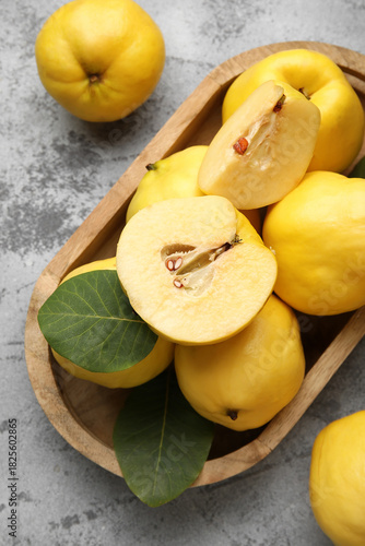 Wooden tray with sweet ripe quinces and leaves on grey background