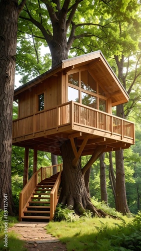 treehouse, wooden, forest, nature, cabin, tranquil, peaceful, rustic, elevated, structure, landscape, exterior, sunlight, cosy, stair, building, architecture, modern, design, patio