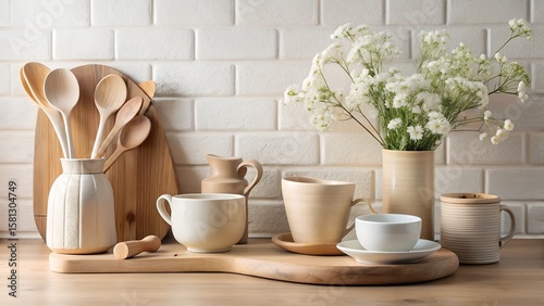 kitchen, wood, ceramic, cup, mug, utensil, spoon, tableware, hot drink, tea, breakfast, dining, decor, home, interior, white, beige, natural, wooden board, chopping board, bouquet, flower, white flower, still life, rustic, minimalist, modern, simple, elegant, kitchen utensile, vase, jug, natural light, wooden, surface
