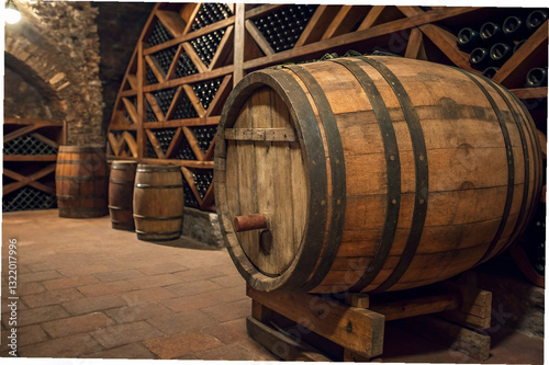 Wooden Wine Barrels in Rustic Cellar with Stone Walls and Shelving, Ideal for Vineyard or Winery Imagery, Reflecting Classic Winemaking Tradition and Atmosphere