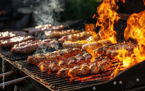 Woodfire flames flickering intensely in a close-up BBQ scene