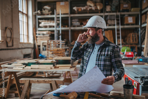 small business, carpenter, man, caucasian, wood, skilled, work, workshop, phone, helmet, order, client, design, client, commission, selling, product, business, tool, woodworker, timber, workbench, phone call, carpenter's shop, industry, studio, local, professional, sanding, men at work, investment, furniture, entrepreneurship, artisan, chisel, maker, traditional, sustainable, carving, handcraft, quality, mallet, plane, laptop, copy space, businessman, concentration