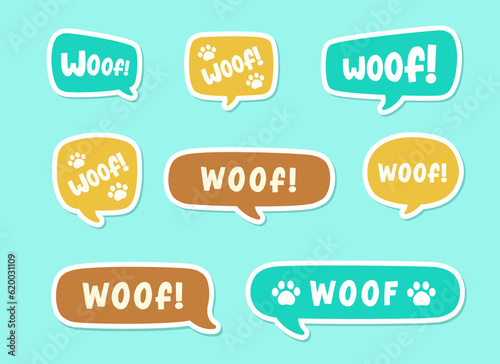 Woof text in a speech bubble balloon set, digital sticker design. Cute cartoon comics dog bark sound effect and lettering. Textured vector illustration.