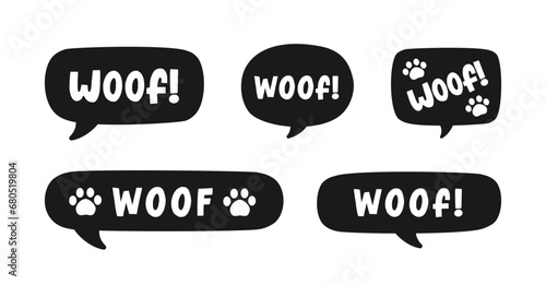 Woof text in a speech bubble balloon silhouette set. Cute cartoon comics dog bark sound effect and lettering. Vector illustration.