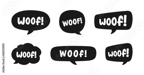 Woof text in a speech bubble balloon silhouette set. Cute cartoon comics dog bark sound effect and lettering. Vector illustration.